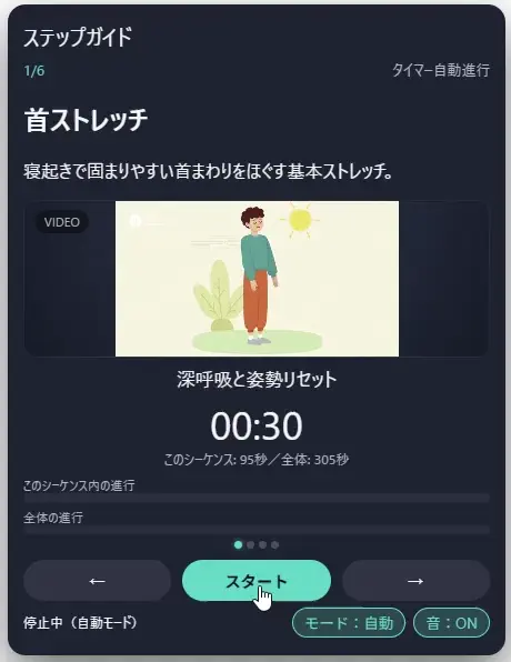 そこで爆誕したのがこのステップガイドWebアプリです。JSON形式で手順書を作成することで、秒数やステップに沿って画像や動画で解説してくれるという便利なもの。もともとストレッチマネージャーとして作っていたけど、作業手順書管理とかにも使えるのでは!?と思ってステップガイドとしてみた。