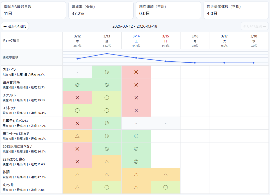 以前はカレンダーに達成率と100%達成したら写真が撮れる、みたいなものを作って使っていたのですが、1週間単位でよいのでもっと視覚的にパッとわかるものがよいなと思い、こうなりました。